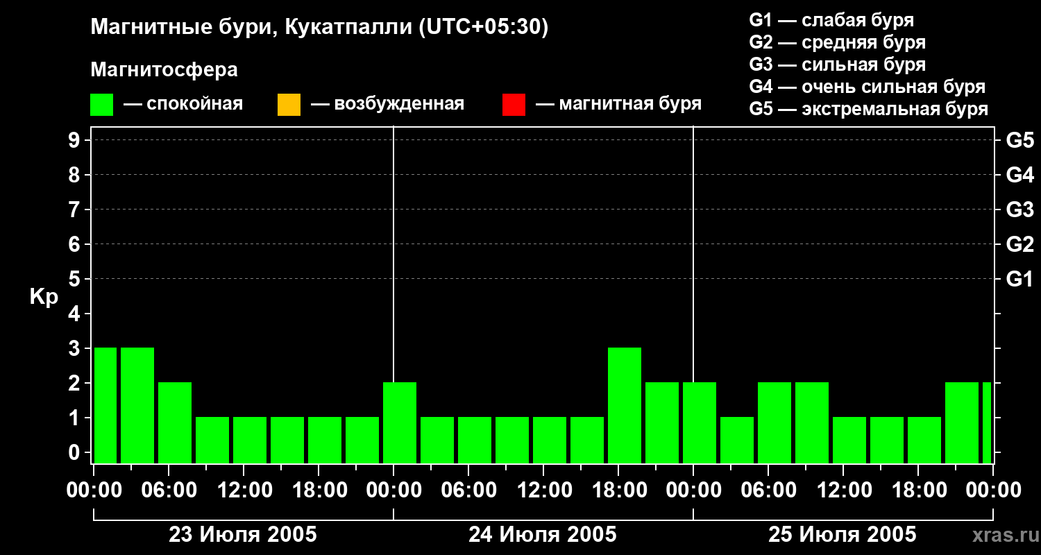 Изменения геомагнитного индекса Kp с 23 по 25 июля 2005 года для средних широт