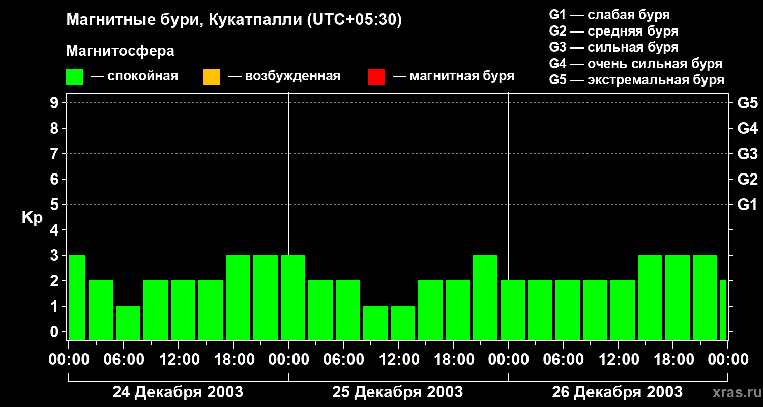 Изменения геомагнитного индекса Kp с 24 по 26 декабря 2003 года для средних широт