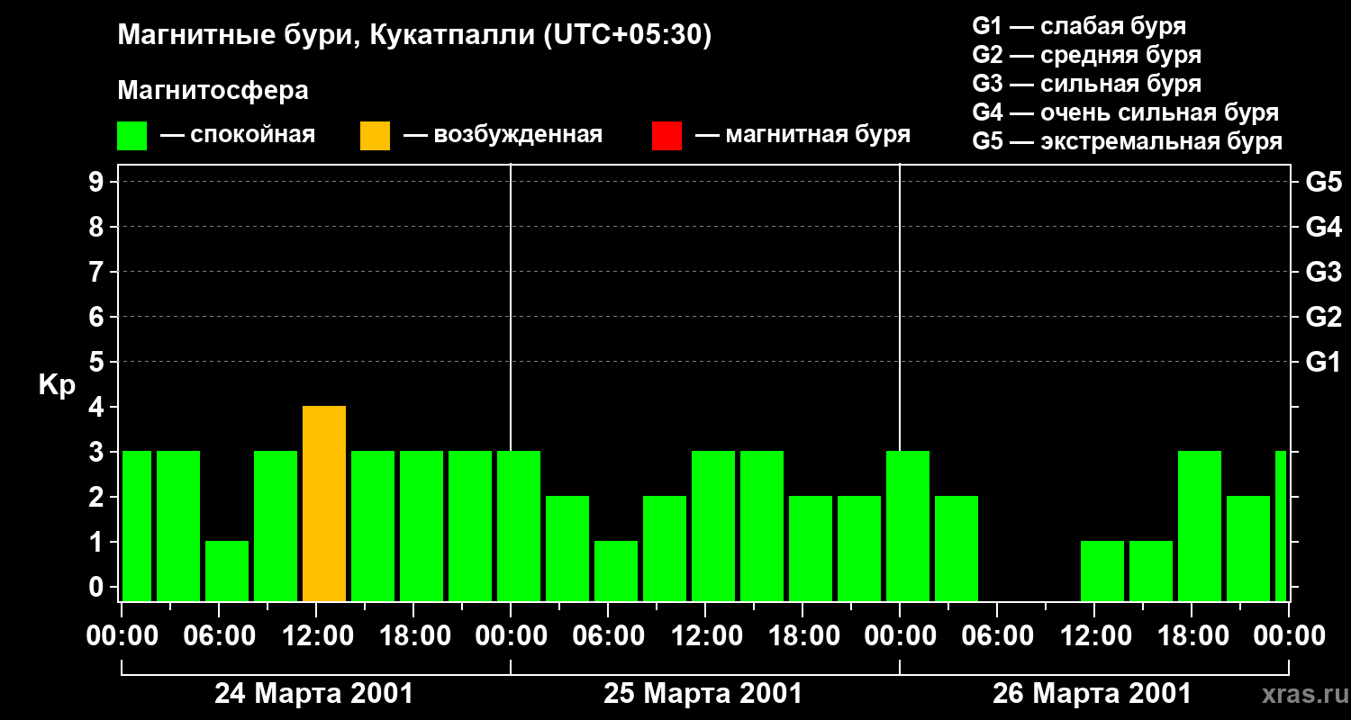 Изменения геомагнитного индекса Kp с 24 по 26 марта 2001 года для средних широт