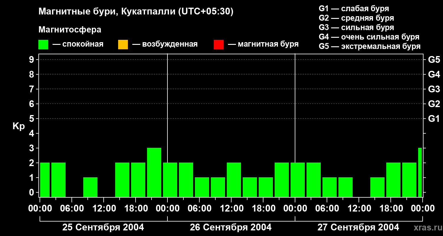 Изменения геомагнитного индекса Kp с 25 по 27 сентября 2004 года для средних широт