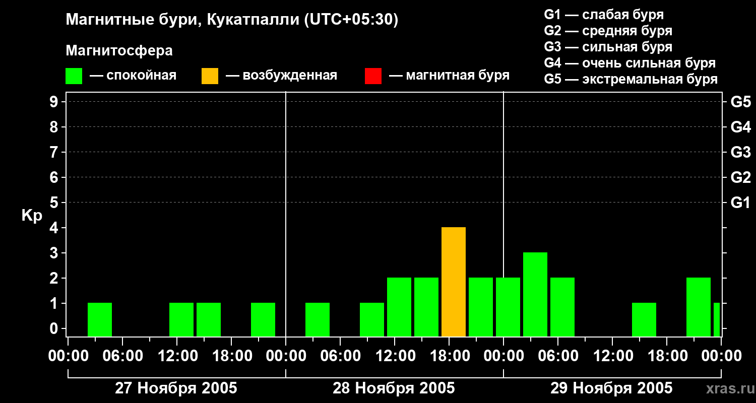Изменения геомагнитного индекса Kp с 27 по 29 ноября 2005 года для средних широт