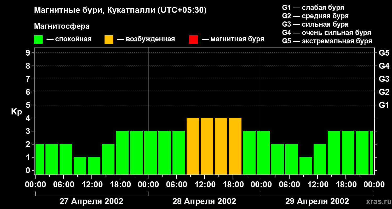 Изменения геомагнитного индекса Kp с 27 по 29 апреля 2002 года для средних широт