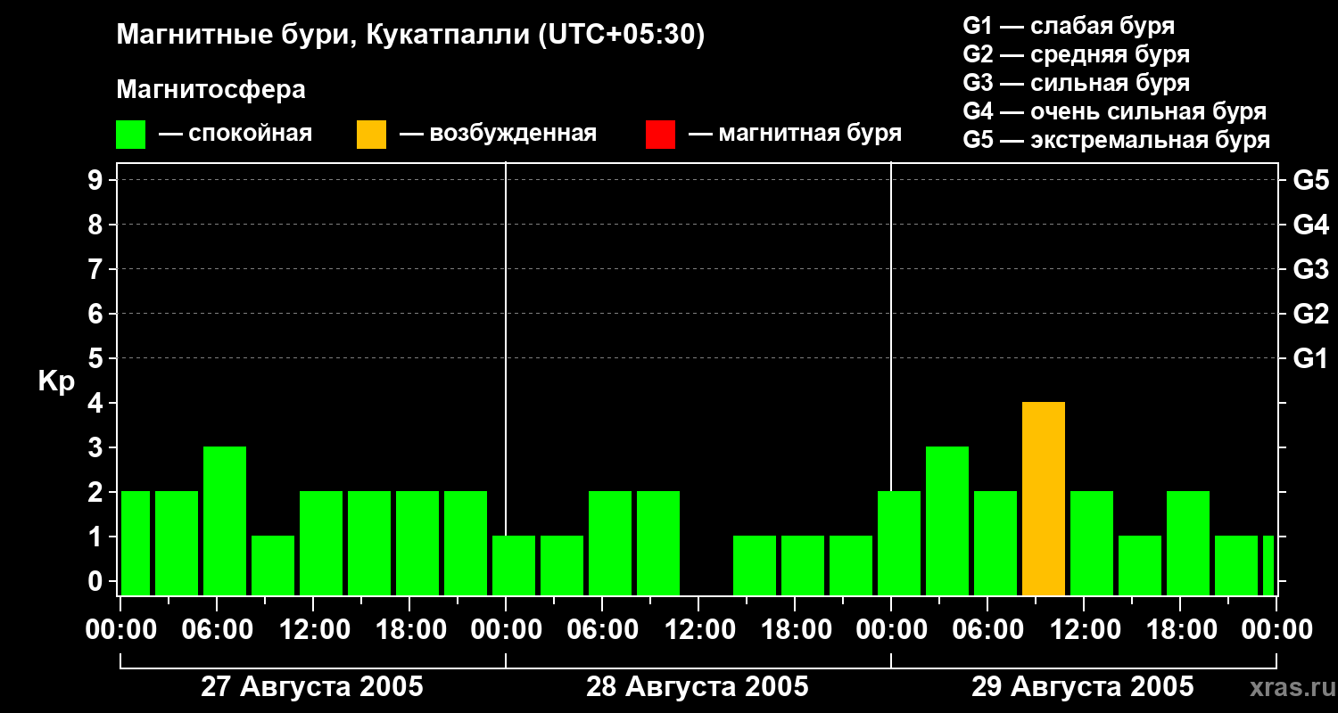Изменения геомагнитного индекса Kp с 27 по 29 августа 2005 года для средних широт