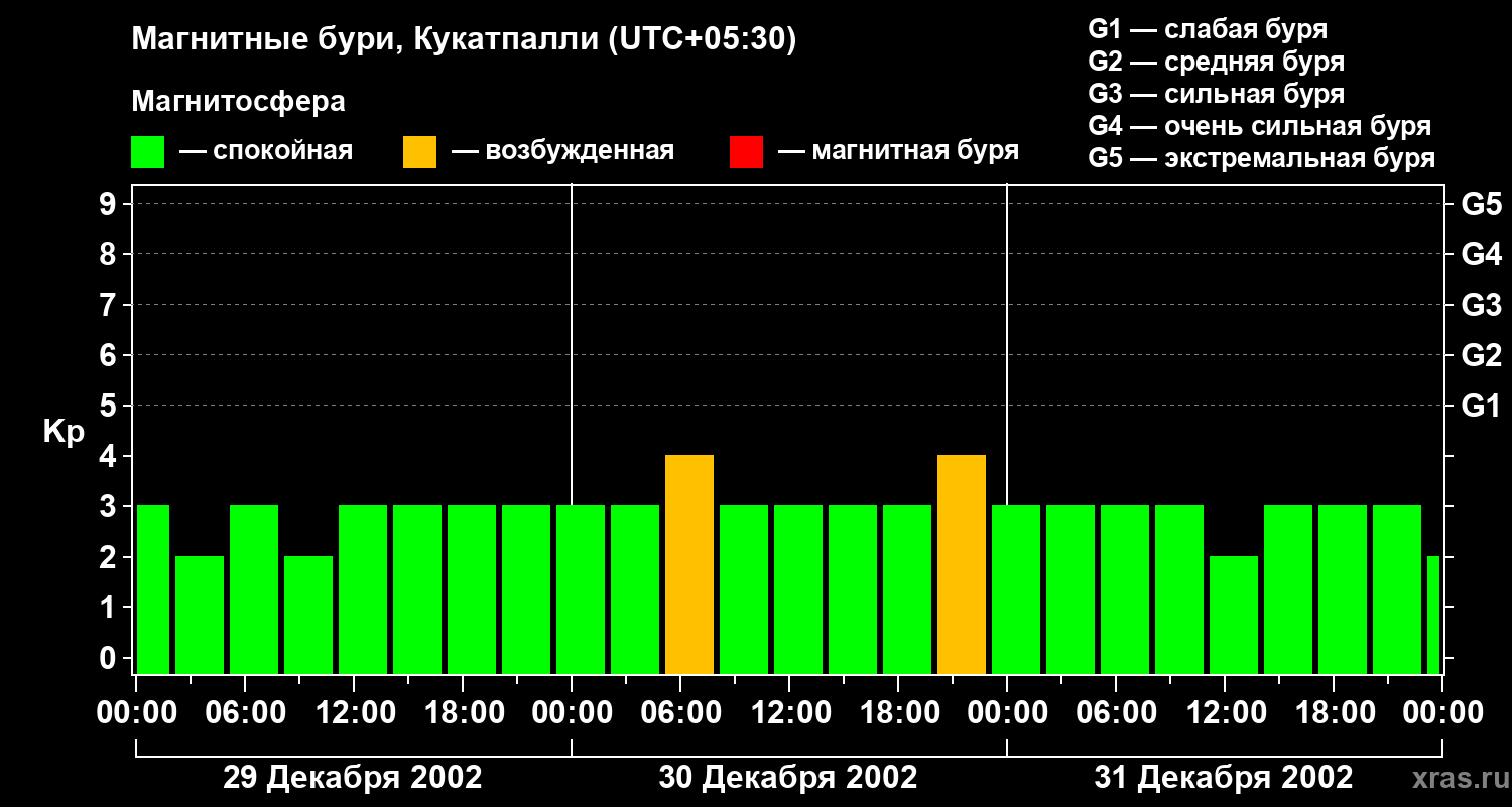 Изменения геомагнитного индекса Kp с 29 по 31 декабря 2002 года для средних широт