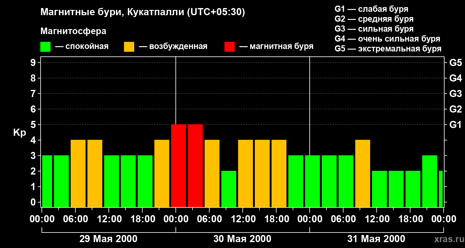 Изменения геомагнитного индекса Kp с 29 по 31 мая 2000 года для средних широт