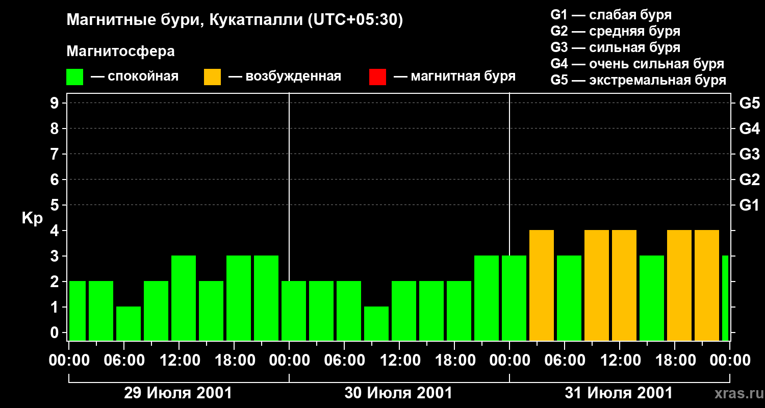 Изменения геомагнитного индекса Kp с 29 по 31 июля 2001 года для средних широт