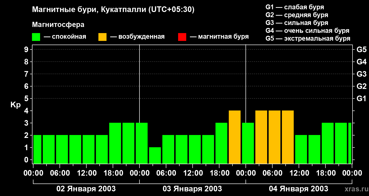 Изменения геомагнитного индекса Kp с 2 по 4 января 2003 года для средних широт