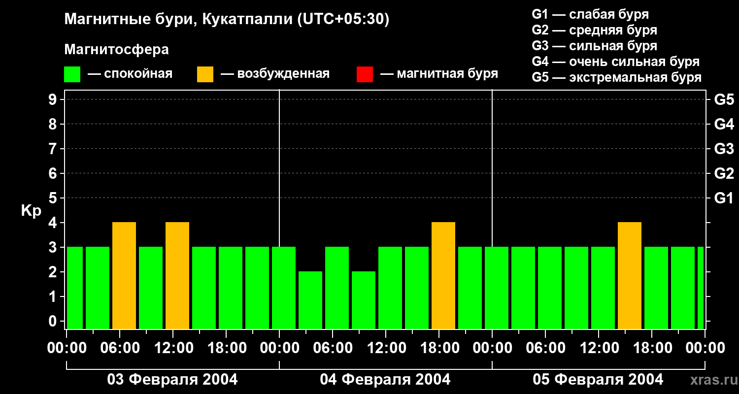 Изменения геомагнитного индекса Kp с 3 по 5 февраля 2004 года для средних широт