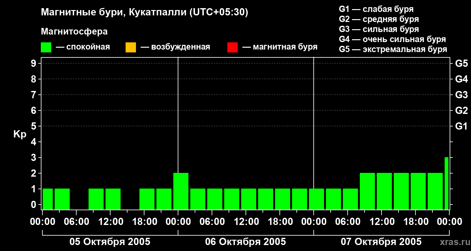 Изменения геомагнитного индекса Kp с 5 по 7 октября 2005 года для средних широт