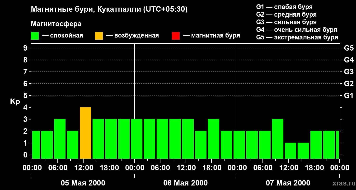 Изменения геомагнитного индекса Kp с 5 по 7 мая 2000 года для средних широт