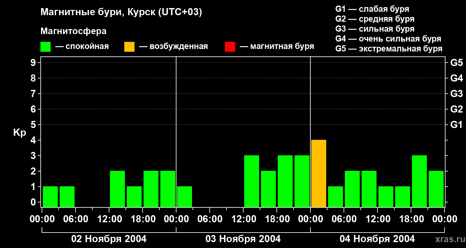 Изменения геомагнитного индекса Kp с 2 по 4 ноября 2004 года для средних широт