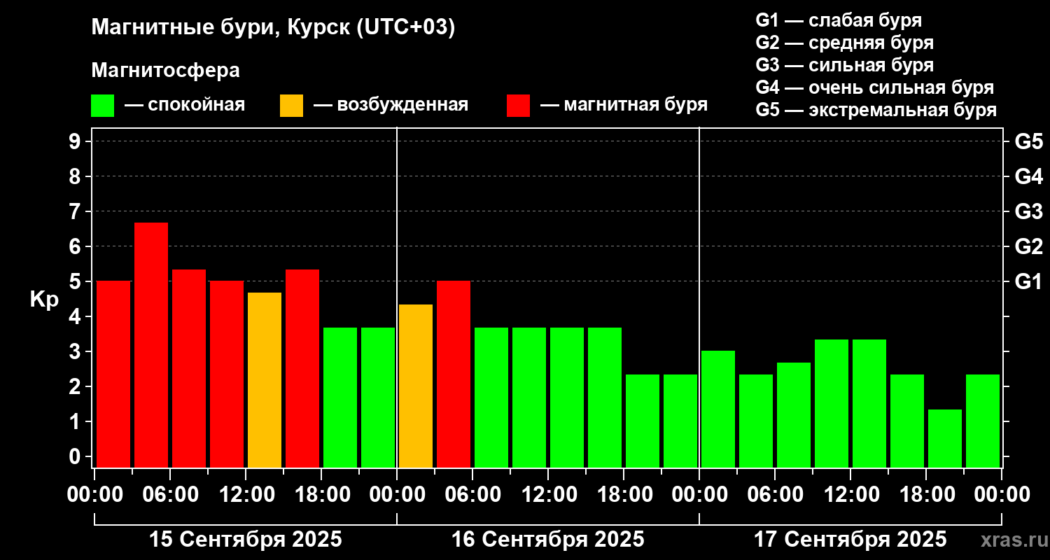Изменения геомагнитного индекса Kp с 15 по 17 сентября 2025 года для средних широт