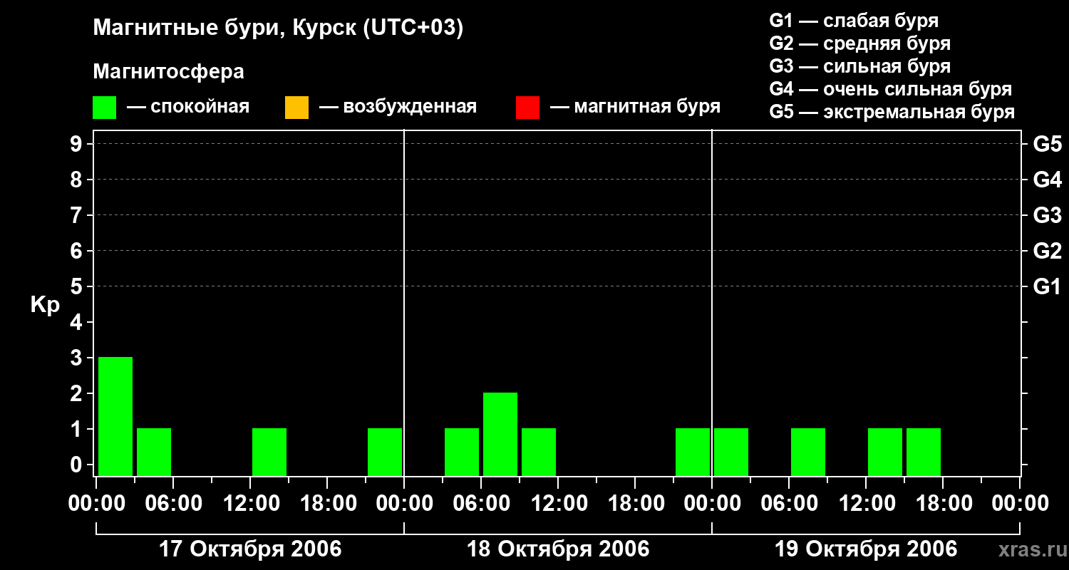 Изменения геомагнитного индекса Kp с 17 по 19 октября 2006 года для средних широт
