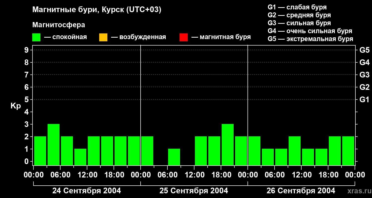 Изменения геомагнитного индекса Kp с 24 по 26 сентября 2004 года для средних широт