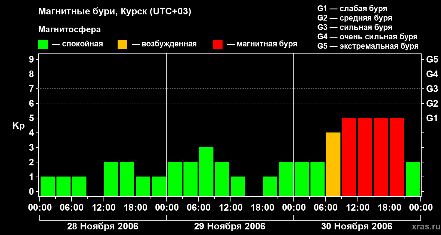 Изменения геомагнитного индекса Kp с 28 по 30 ноября 2006 года для средних широт