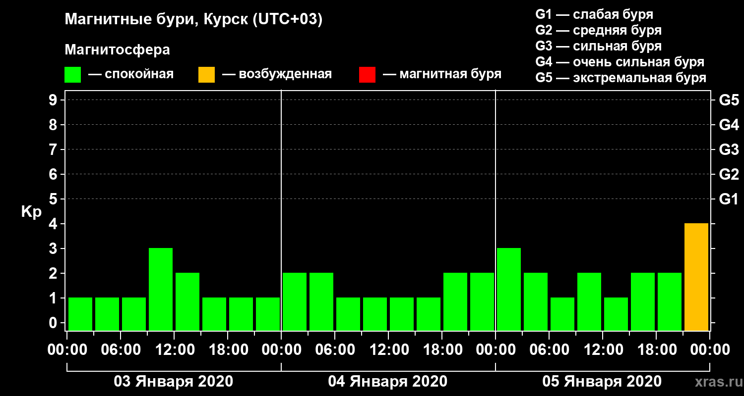 Изменения геомагнитного индекса Kp с 3 по 5 января 2020 года для средних широт