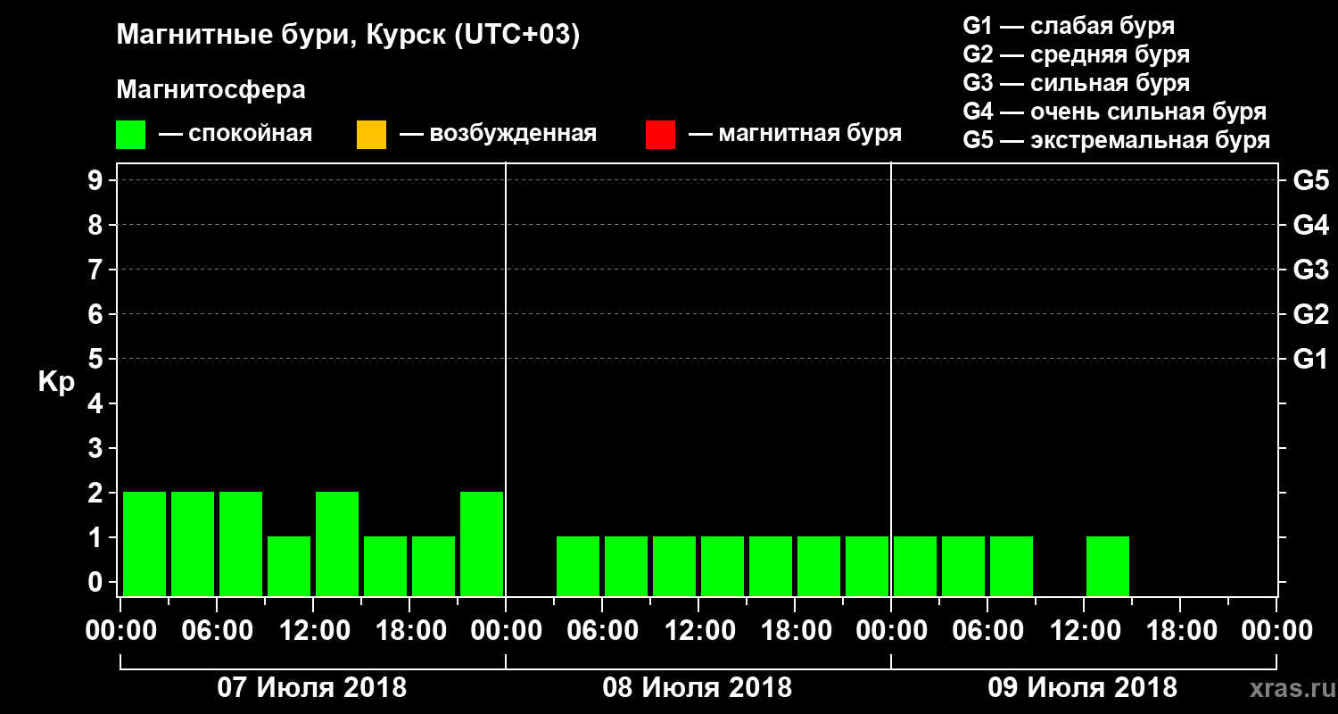Изменения геомагнитного индекса Kp с 7 по 9 июля 2018 года для средних широт