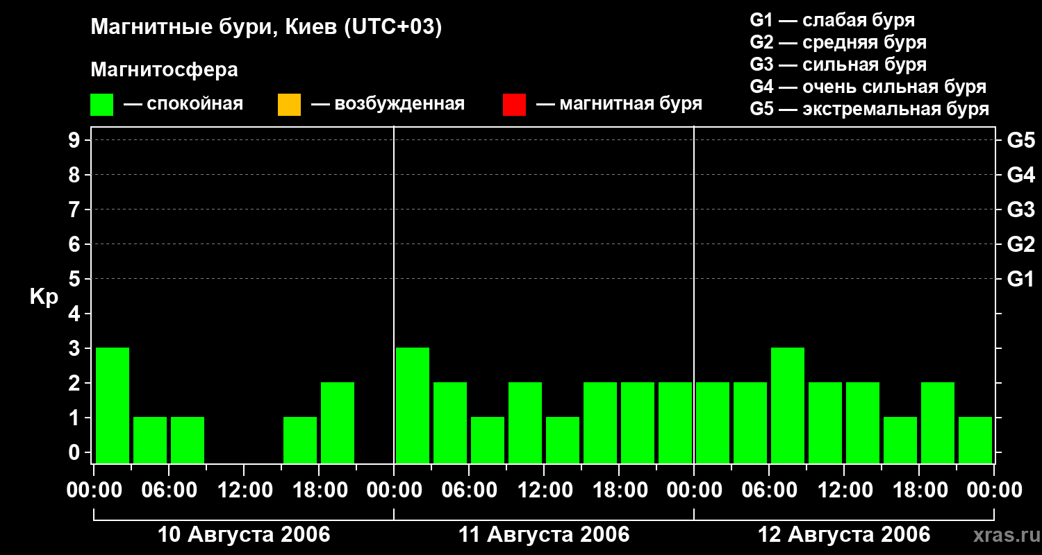 Изменения геомагнитного индекса Kp с 10 по 12 августа 2006 года для средних широт