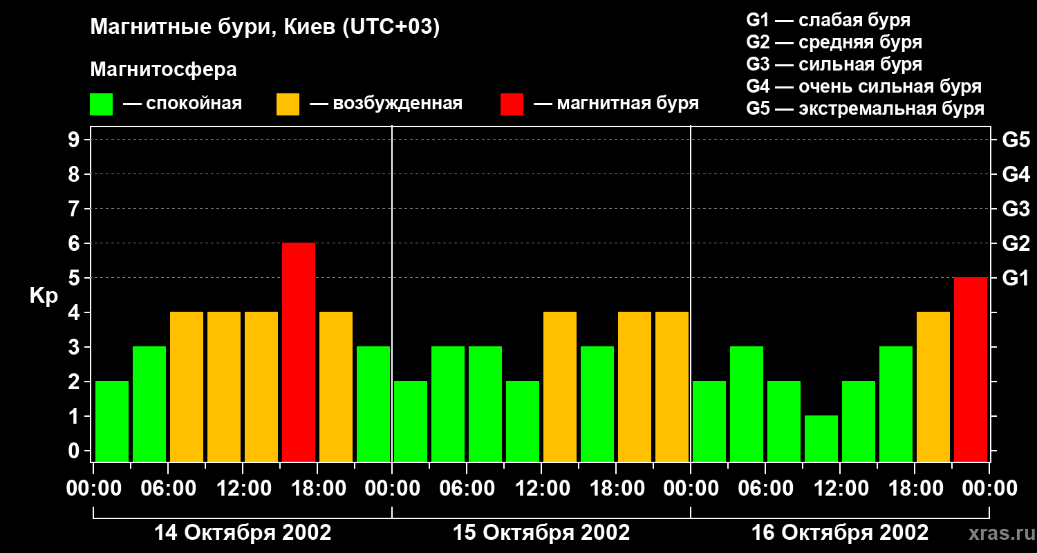 Изменения геомагнитного индекса Kp с 14 по 16 октября 2002 года для средних широт
