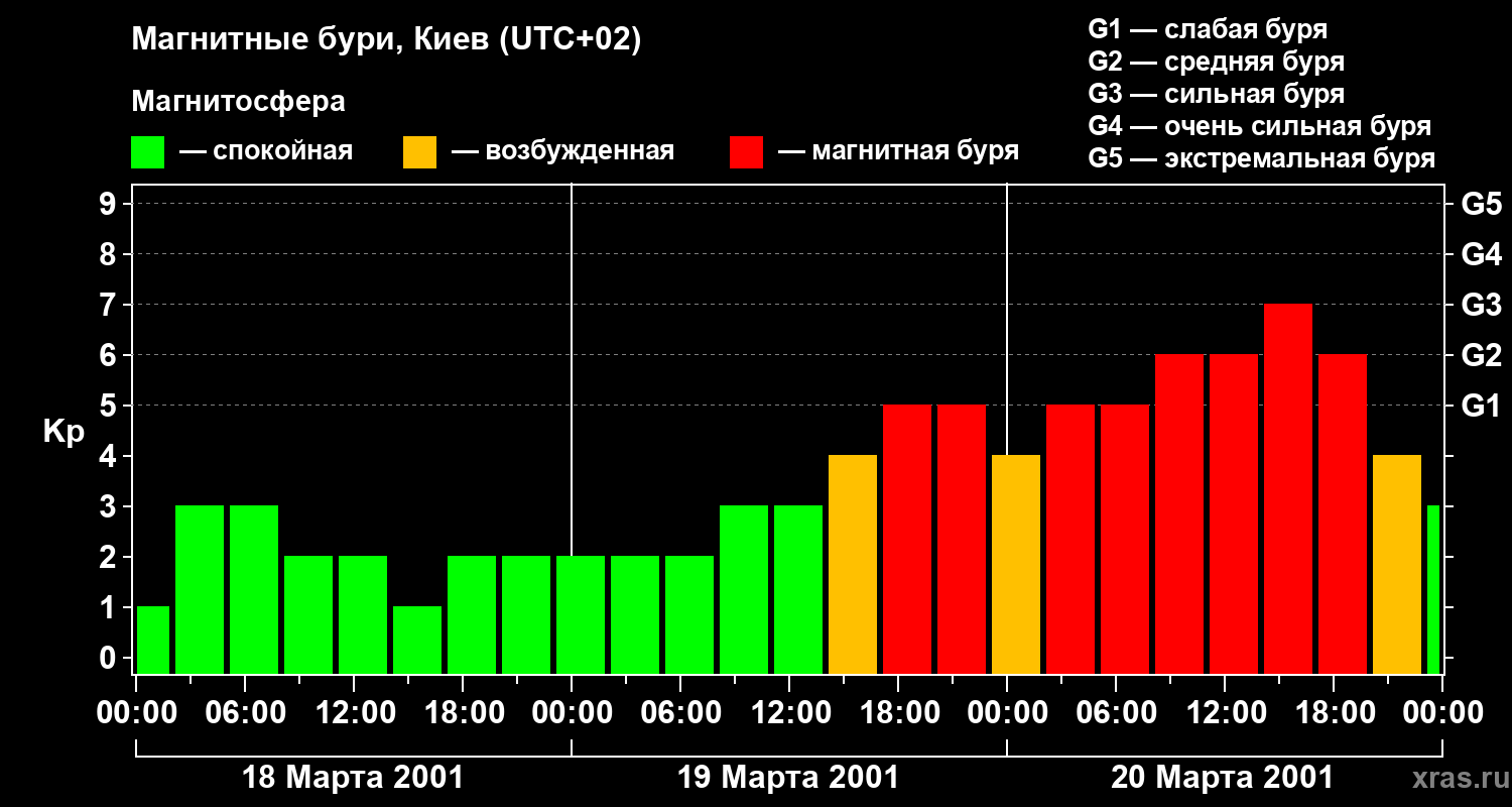 Изменения геомагнитного индекса Kp с 18 по 20 марта 2001 года для средних широт