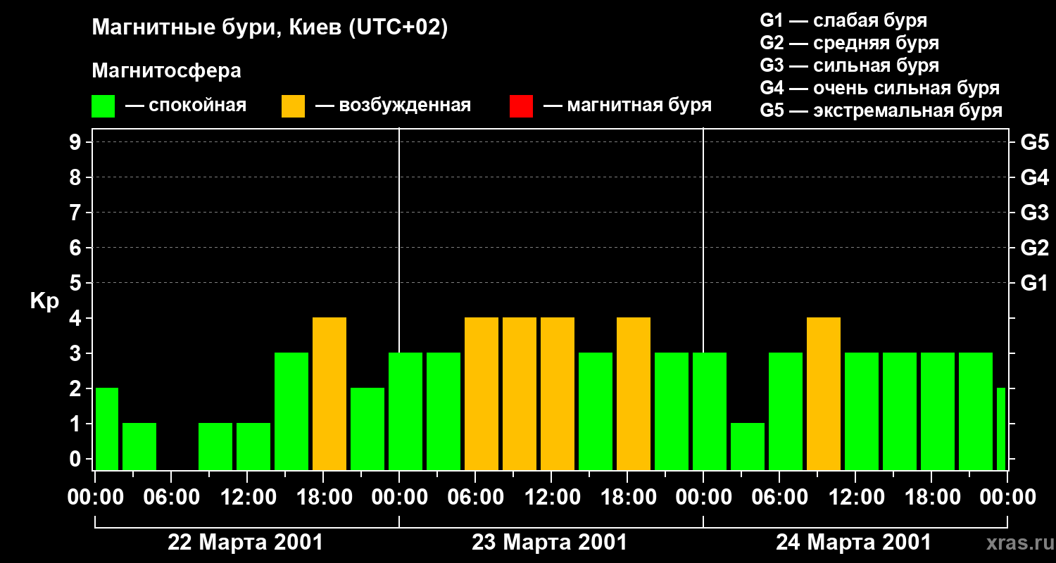 Изменения геомагнитного индекса Kp с 22 по 24 марта 2001 года для средних широт