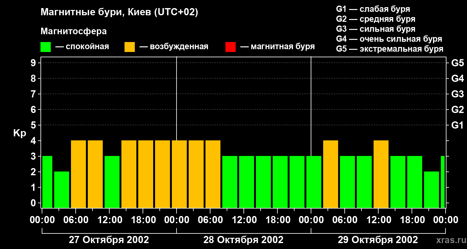 Изменения геомагнитного индекса Kp с 27 по 29 октября 2002 года для средних широт
