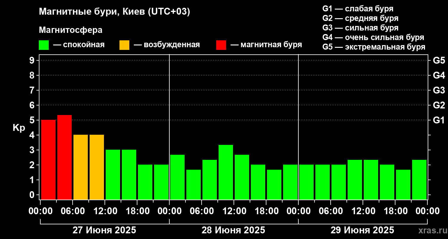 Изменения геомагнитного индекса Kp с 27 по 29 июня 2025 года для средних широт