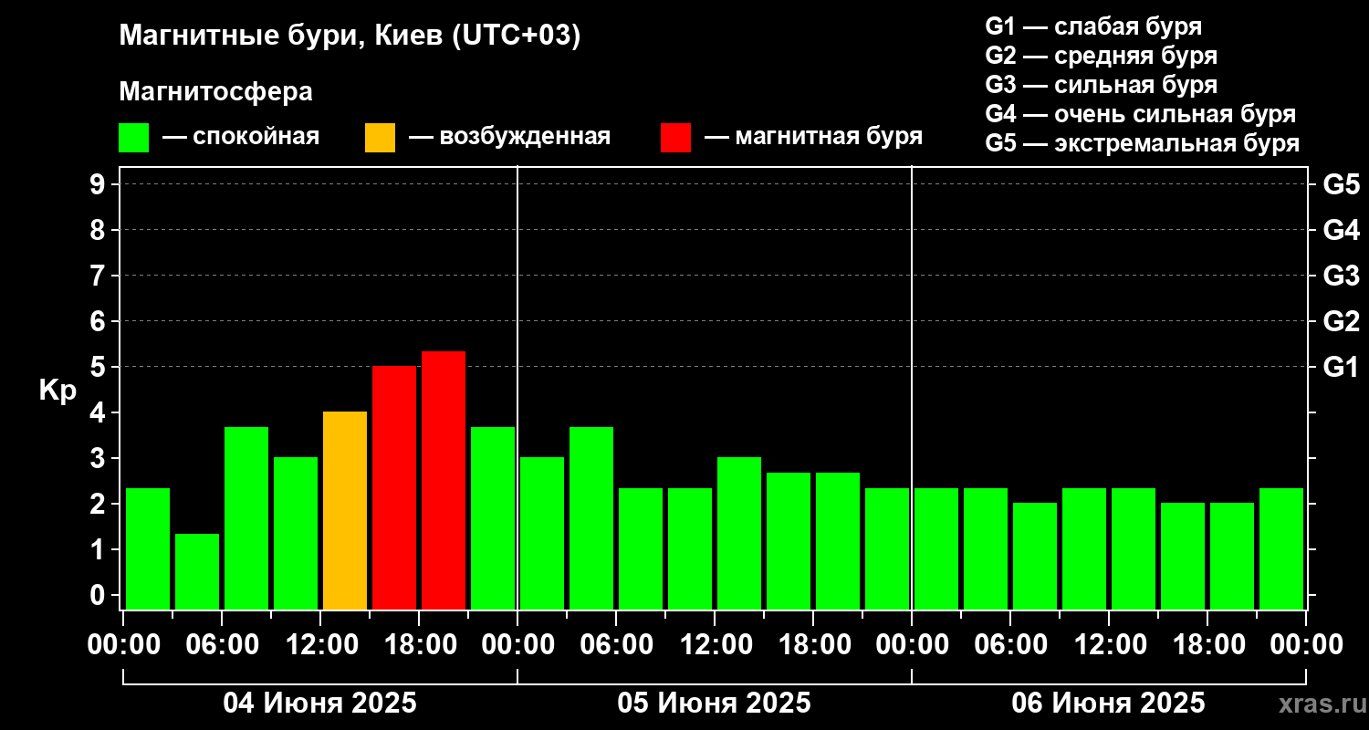 Изменения геомагнитного индекса Kp с 4 по 6 июня 2025 года для средних широт