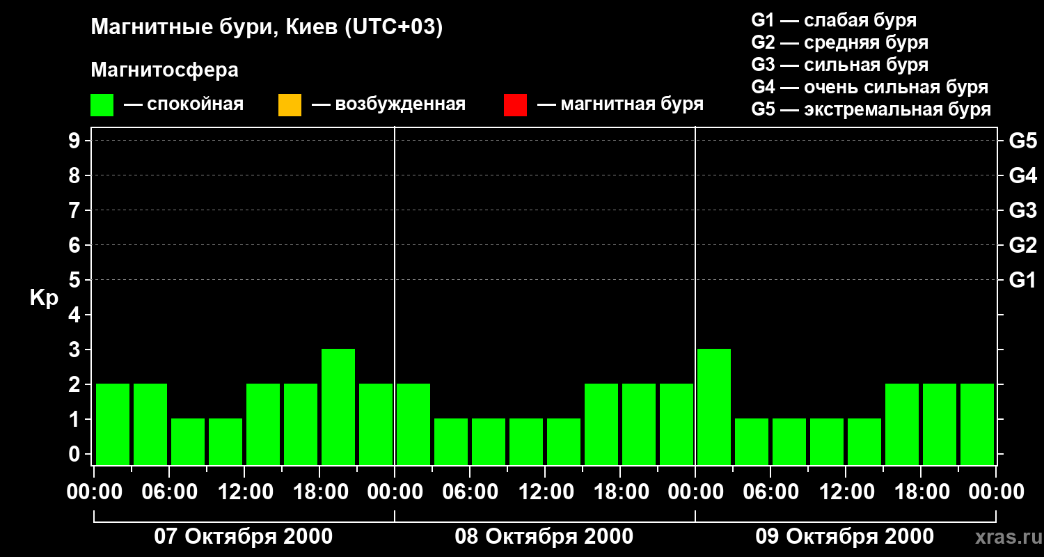 Изменения геомагнитного индекса Kp с 7 по 9 октября 2000 года для средних широт