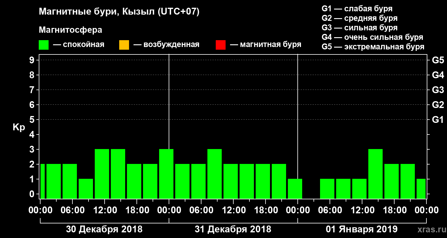 Изменения геомагнитного индекса Kp с 30 декабря 2018 года по 1 января 2019 года для средних широт