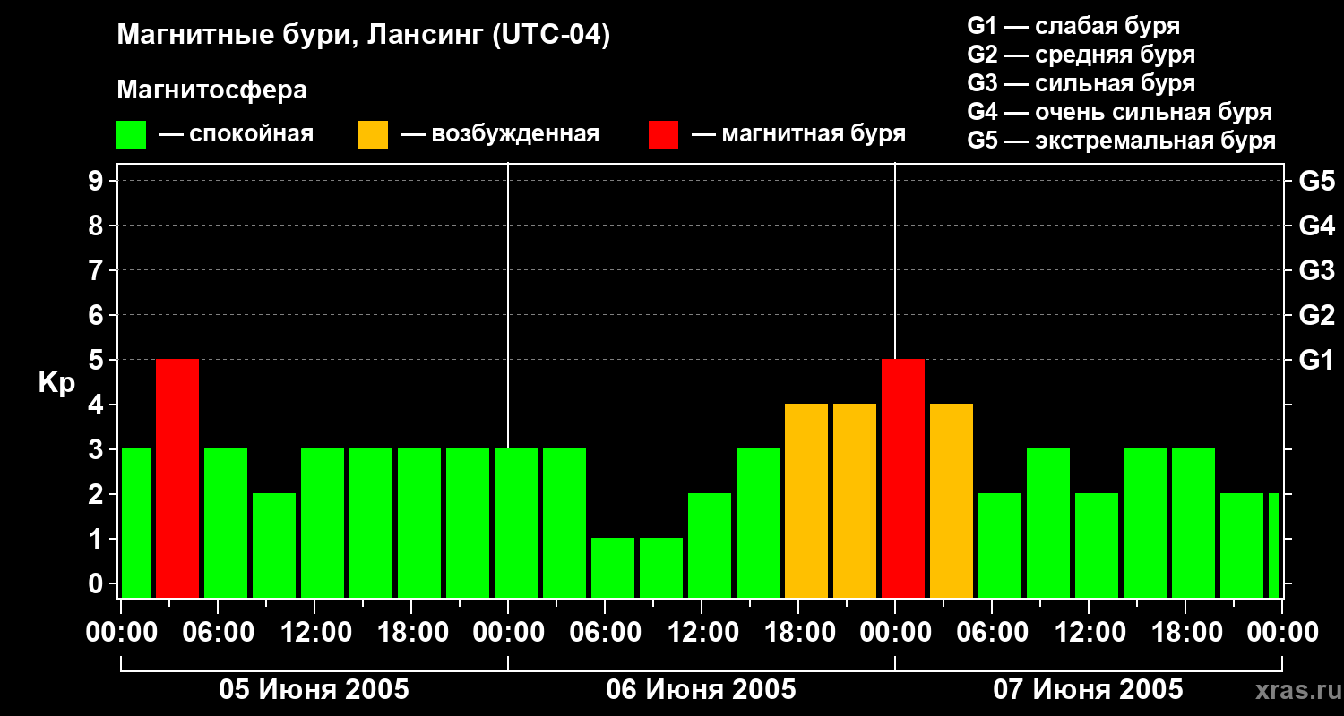 Изменения геомагнитного индекса Kp с 5 по 7 июня 2005 года для средних широт