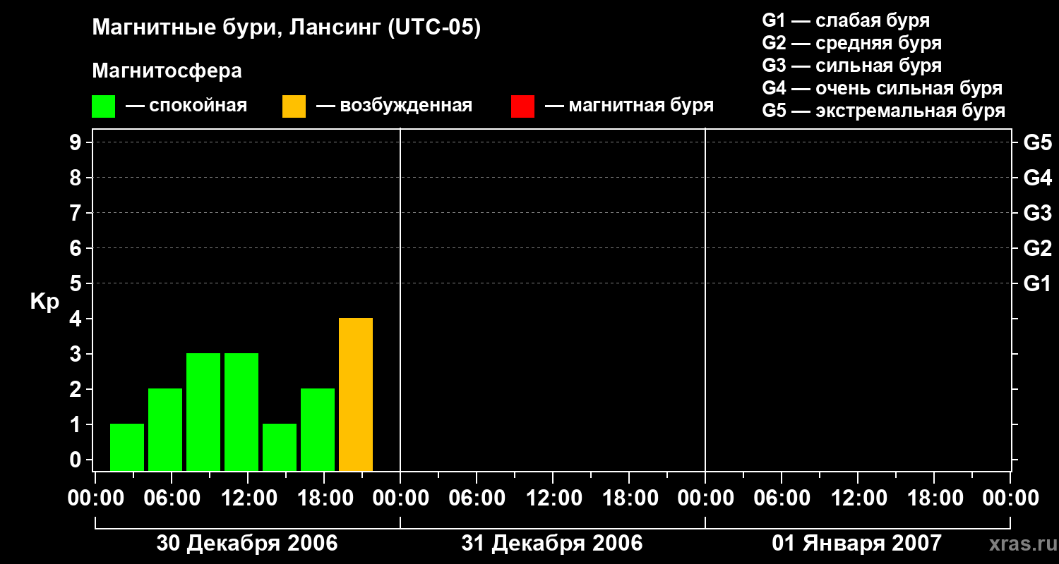 Изменения геомагнитного индекса Kp с 30 декабря 2006 года по 1 января 2007 года для средних широт