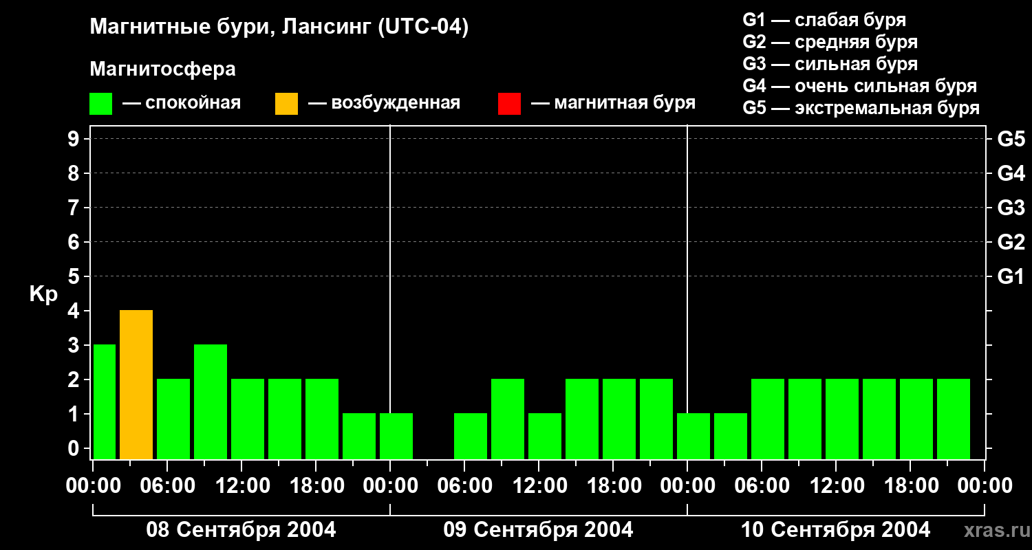 Изменения геомагнитного индекса Kp с 8 по 10 сентября 2004 года для средних широт