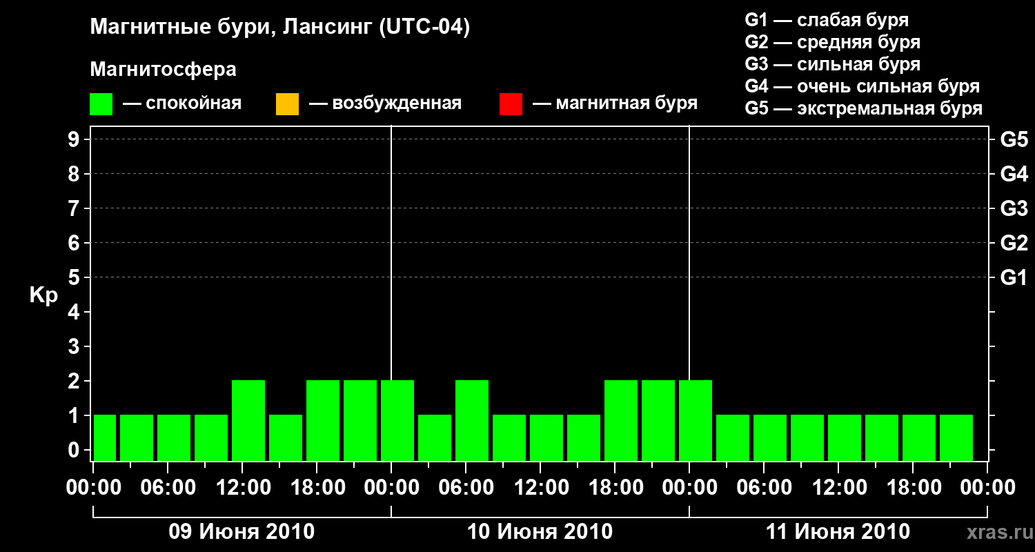 Изменения геомагнитного индекса Kp с 9 по 11 июня 2010 года для средних широт