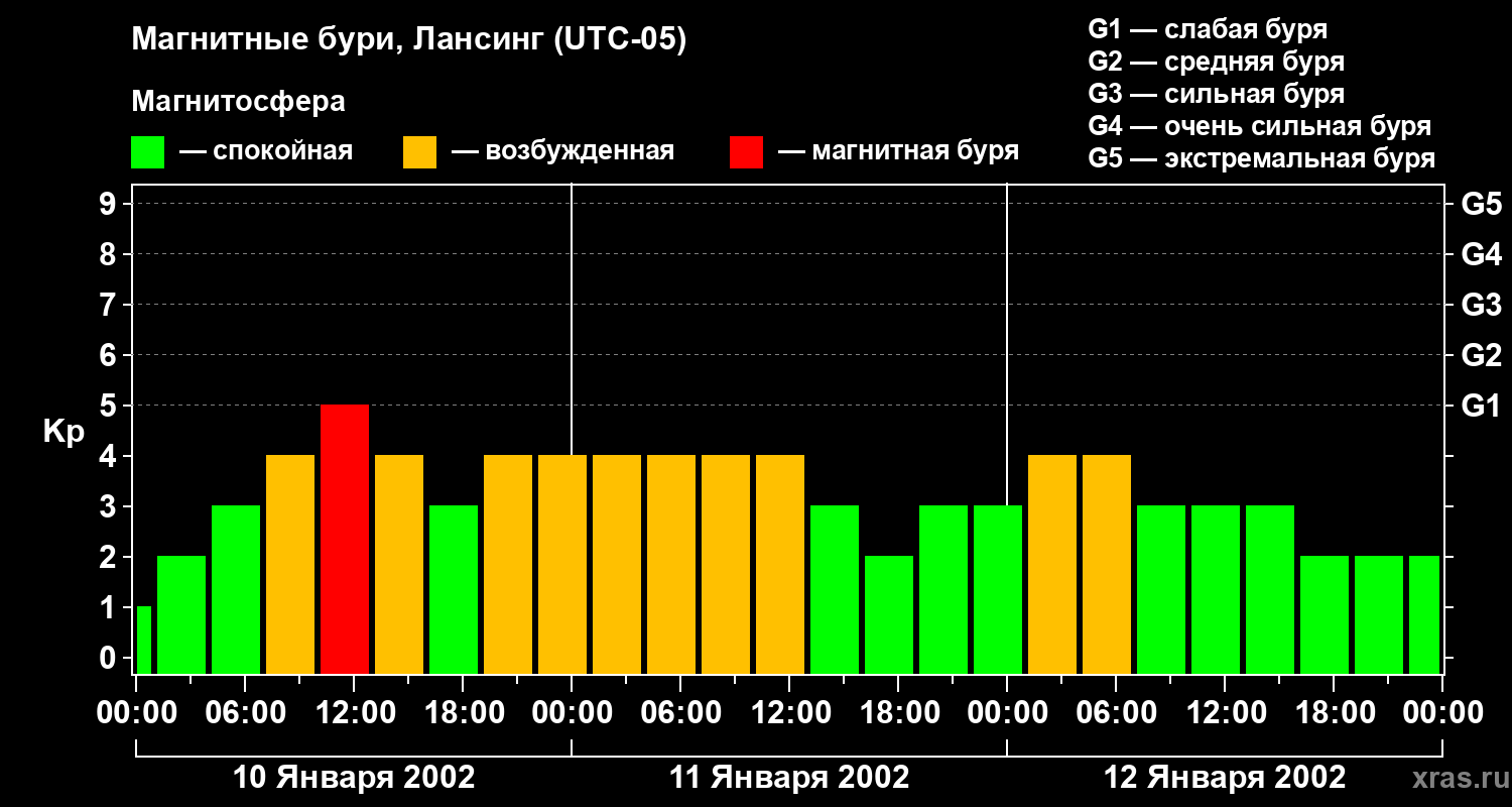 Изменения геомагнитного индекса Kp с 10 по 12 января 2002 года для средних широт