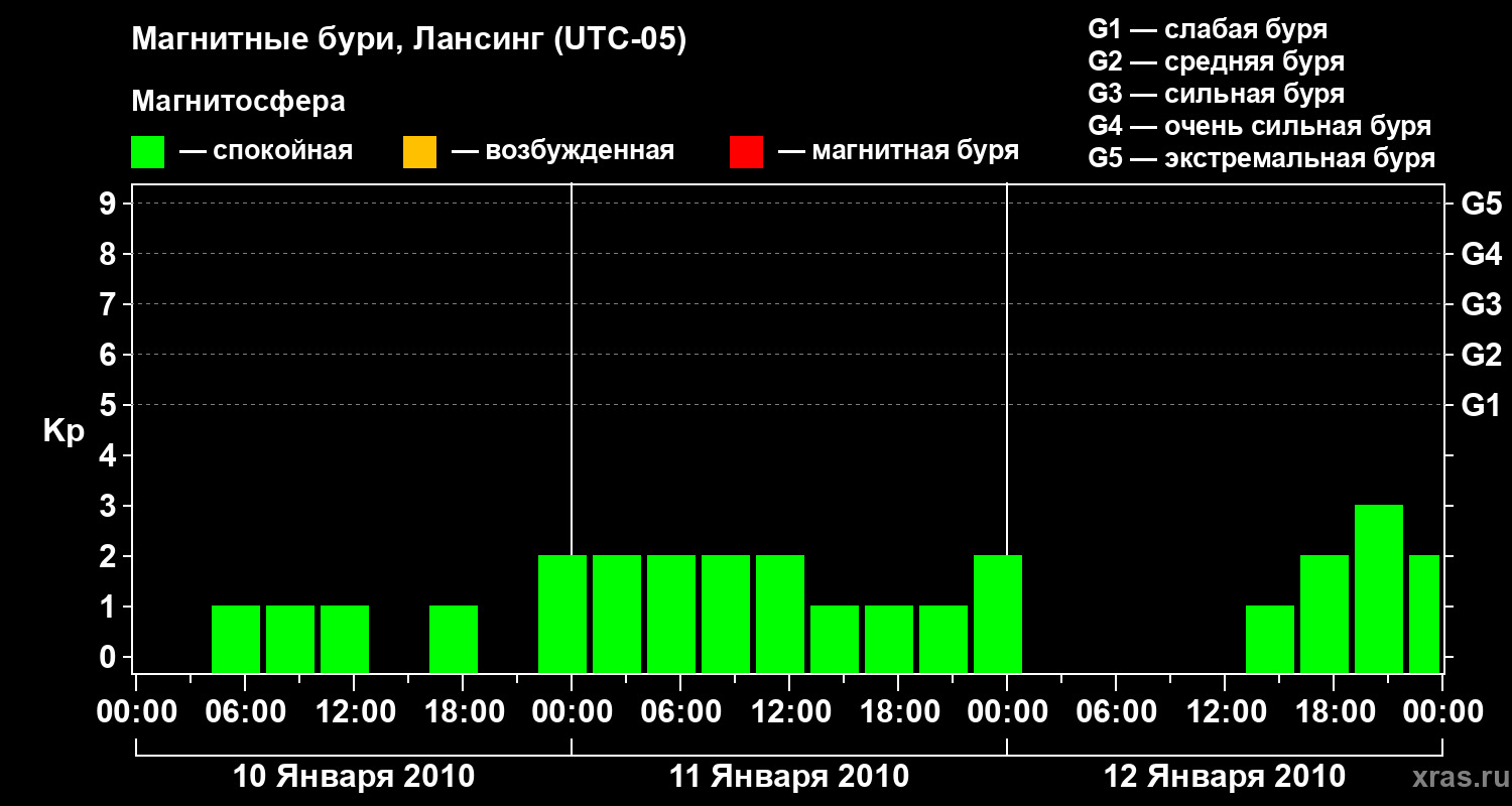 Изменения геомагнитного индекса Kp с 10 по 12 января 2010 года для средних широт