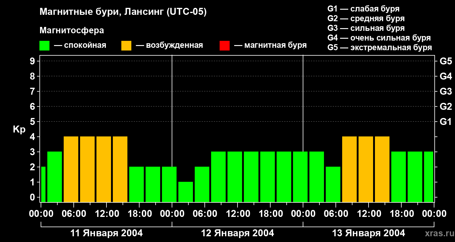 Изменения геомагнитного индекса Kp с 11 по 13 января 2004 года для средних широт