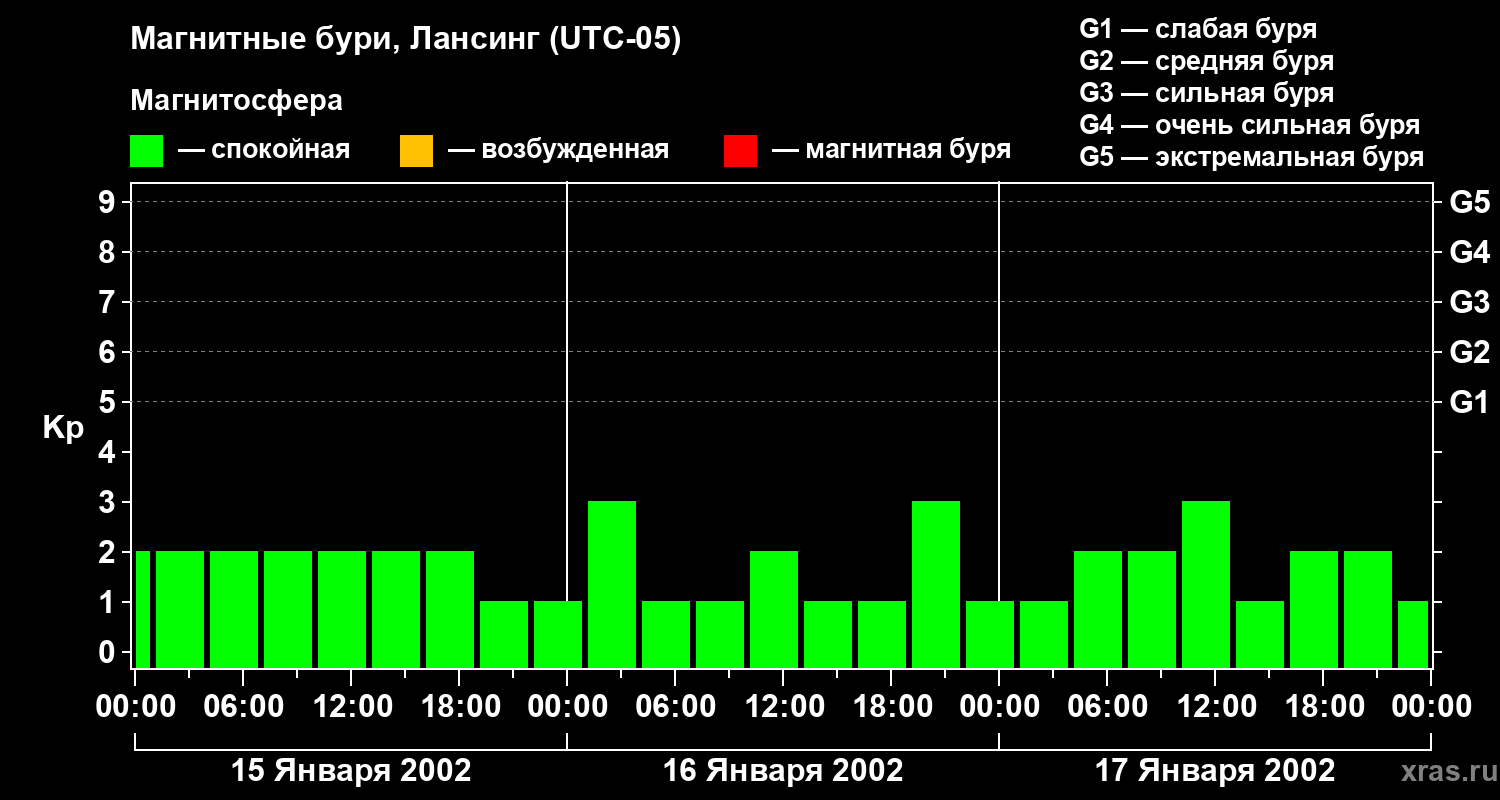 Изменения геомагнитного индекса Kp с 15 по 17 января 2002 года для средних широт