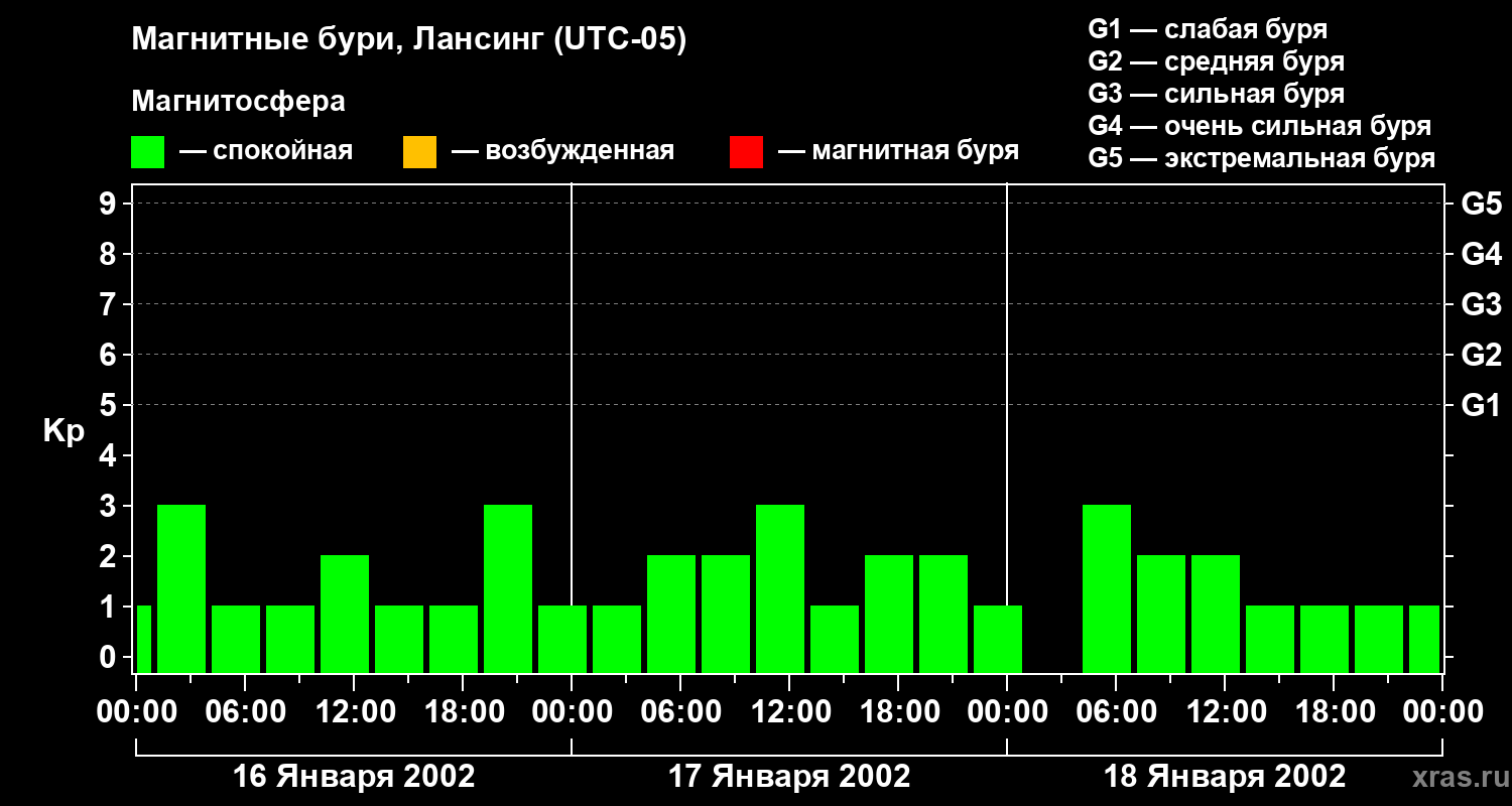 Изменения геомагнитного индекса Kp с 16 по 18 января 2002 года для средних широт
