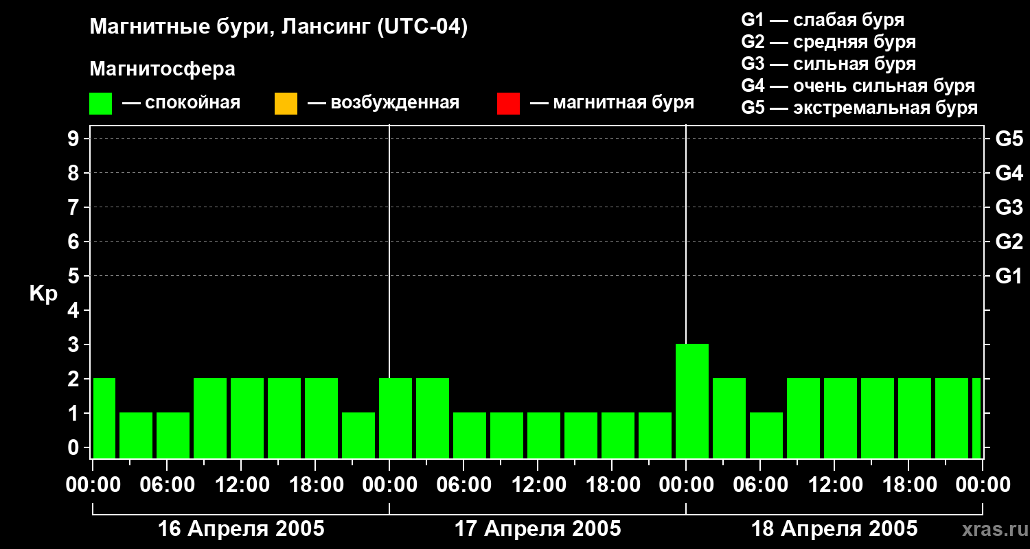 Изменения геомагнитного индекса Kp с 16 по 18 апреля 2005 года для средних широт