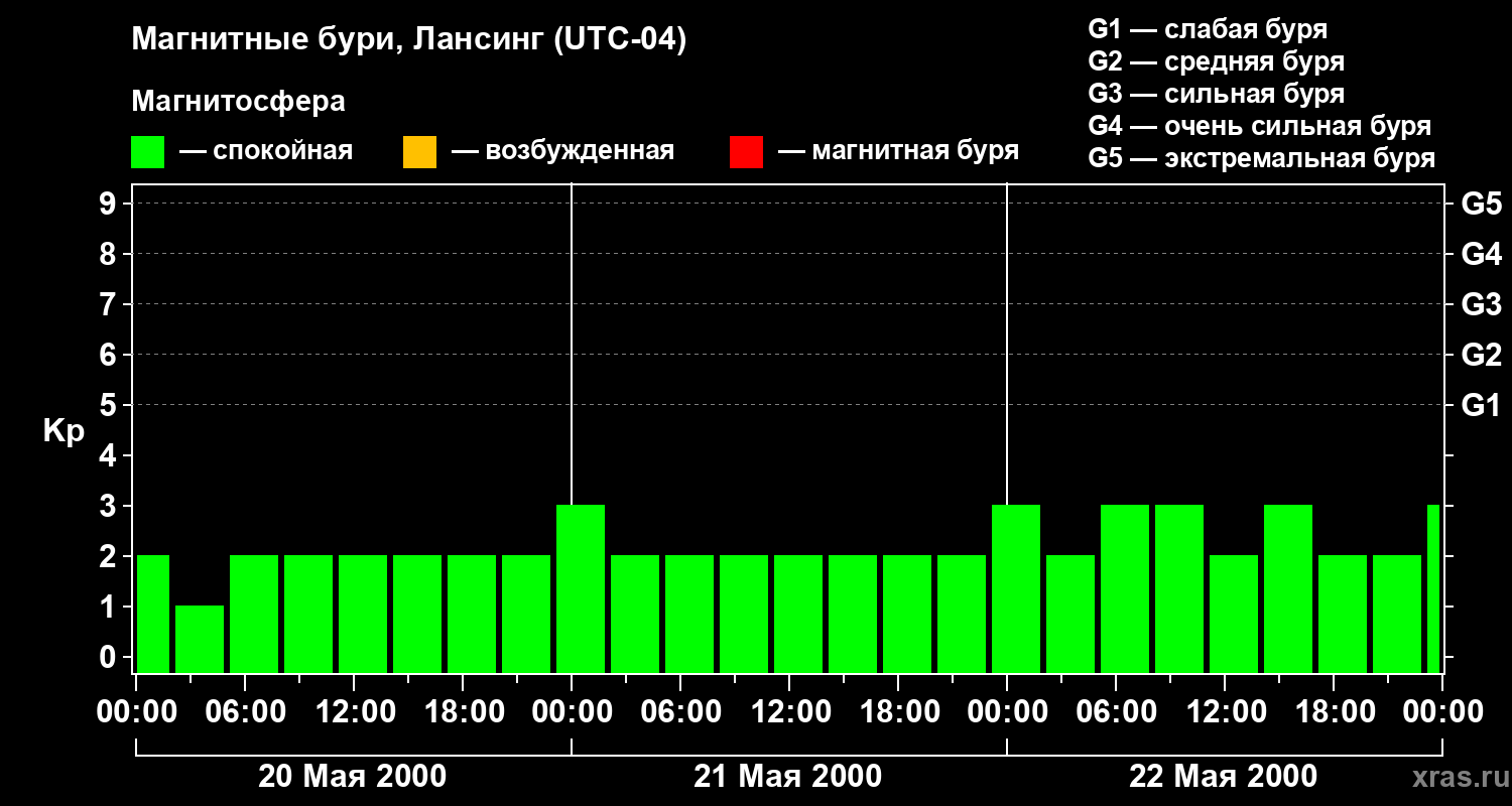 Изменения геомагнитного индекса Kp с 20 по 22 мая 2000 года для средних широт