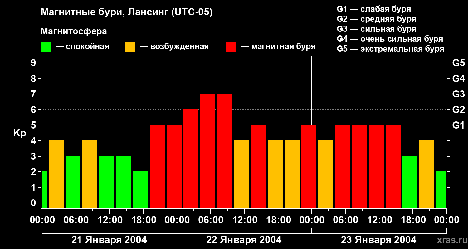 Изменения геомагнитного индекса Kp с 21 по 23 января 2004 года для средних широт