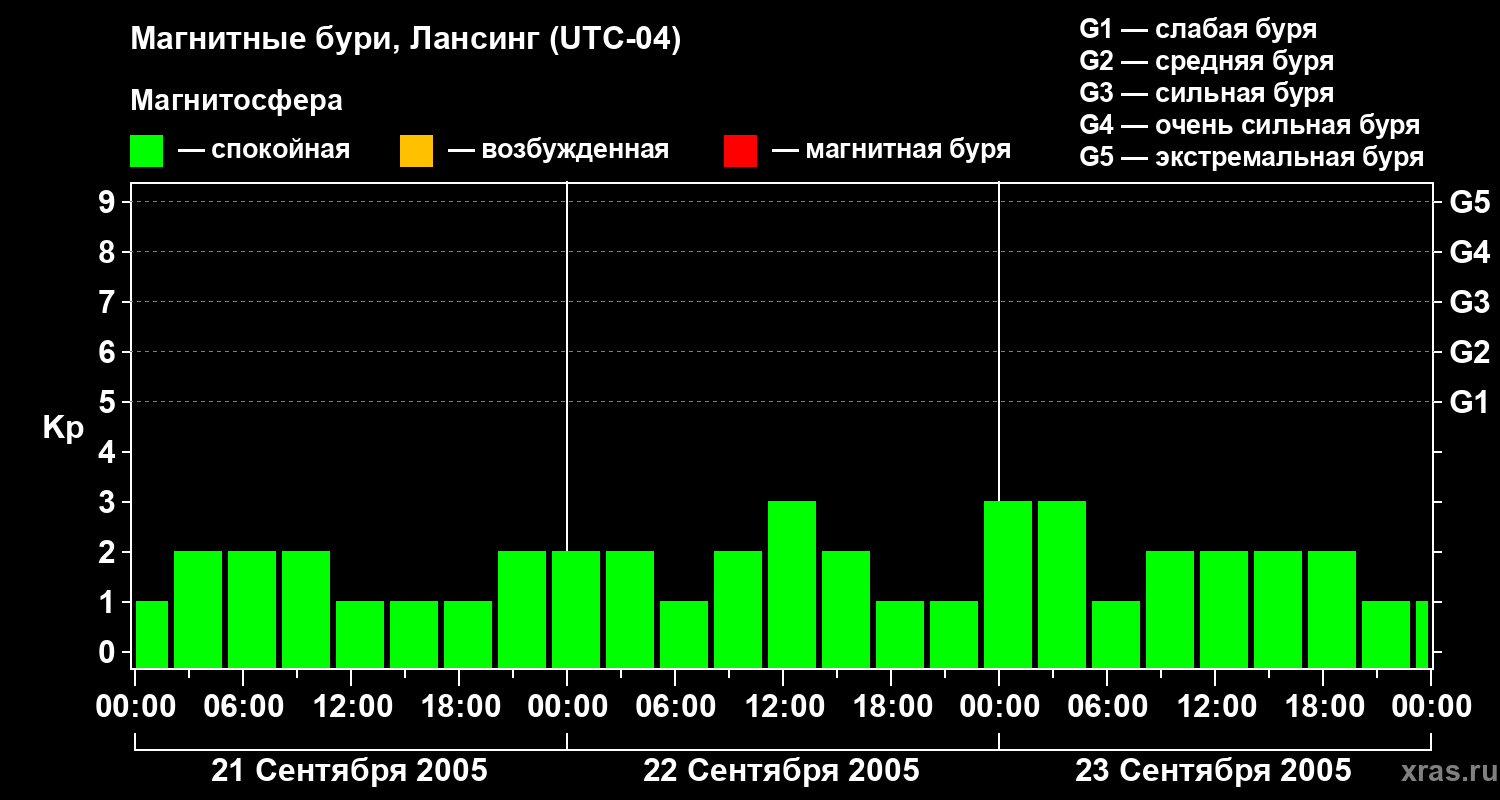 Изменения геомагнитного индекса Kp с 21 по 23 сентября 2005 года для средних широт