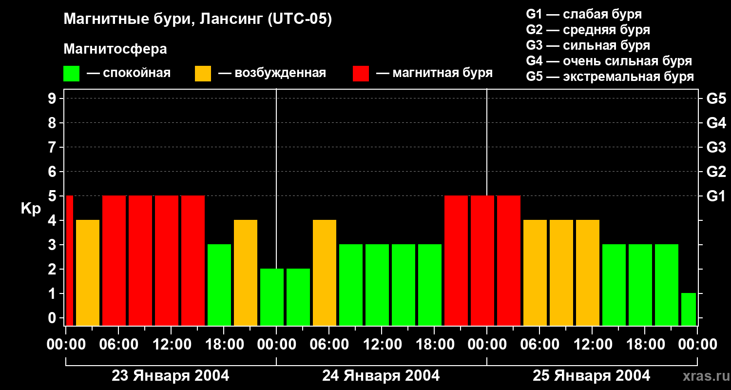 Изменения геомагнитного индекса Kp с 23 по 25 января 2004 года для средних широт