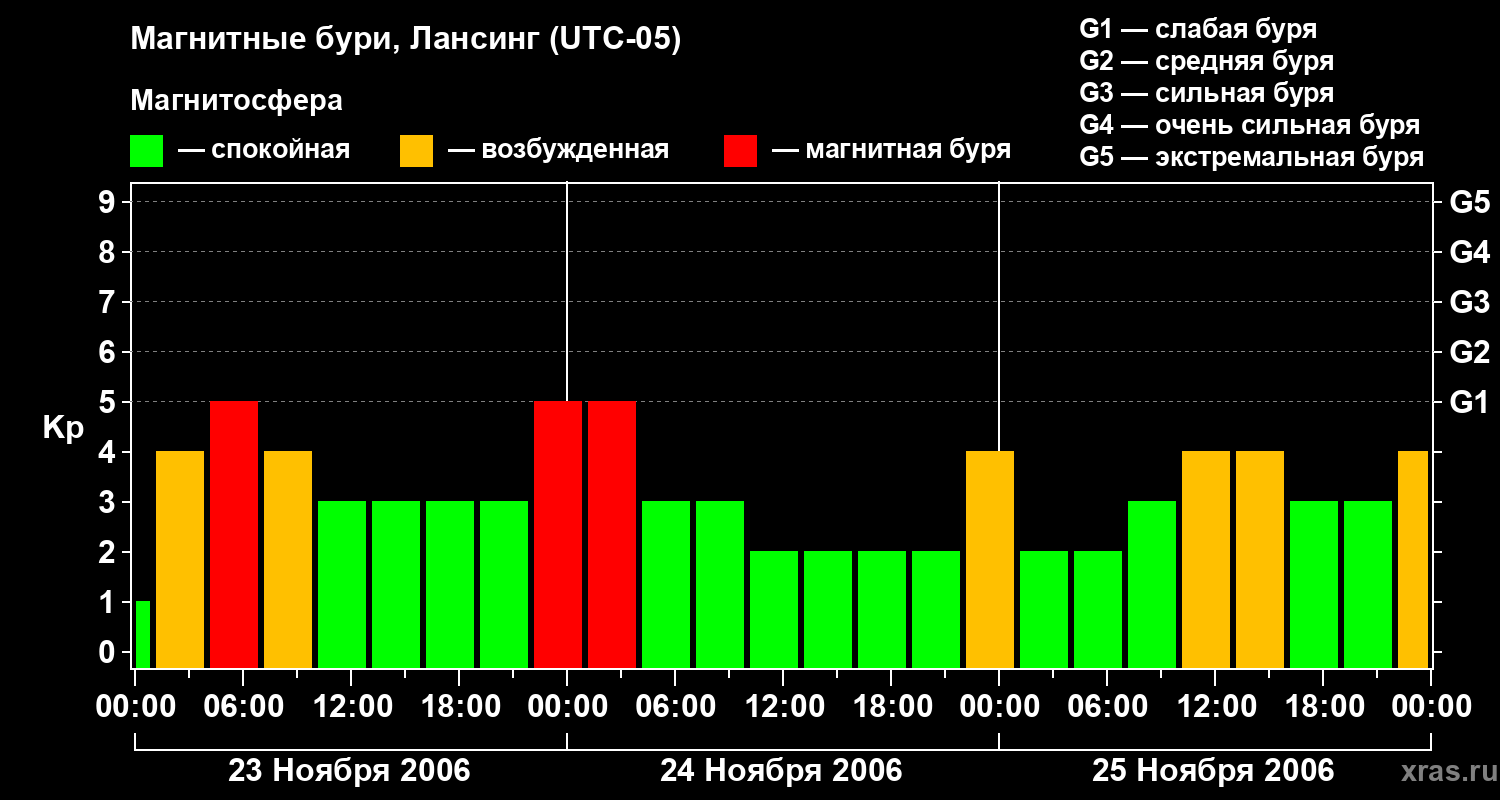 Изменения геомагнитного индекса Kp с 23 по 25 ноября 2006 года для средних широт