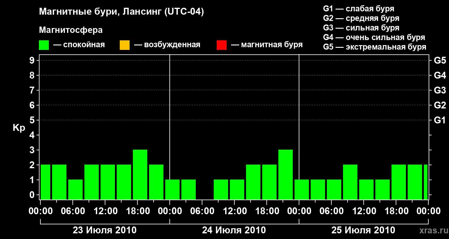 Изменения геомагнитного индекса Kp с 23 по 25 июля 2010 года для средних широт