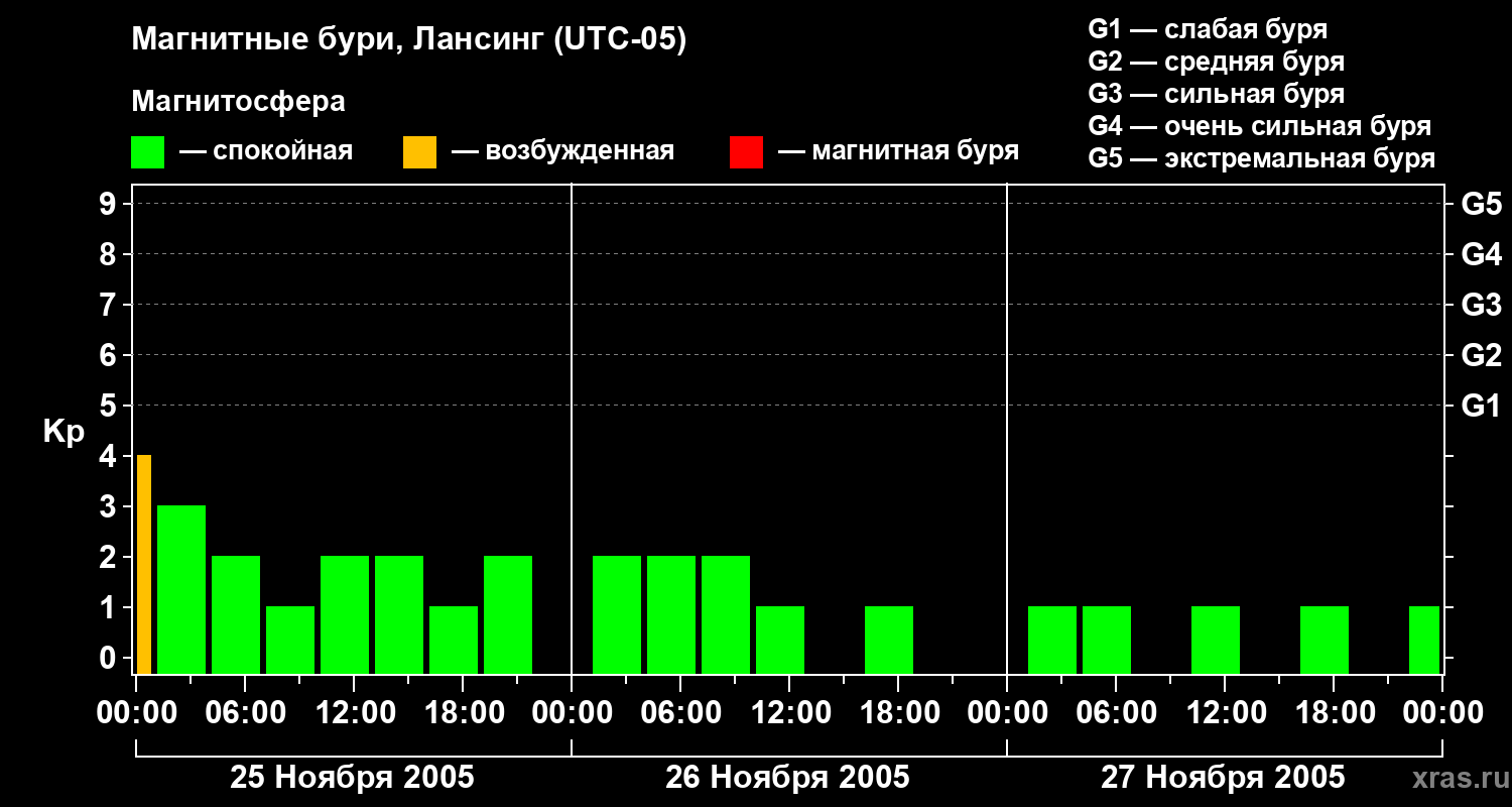 Изменения геомагнитного индекса Kp с 25 по 27 ноября 2005 года для средних широт