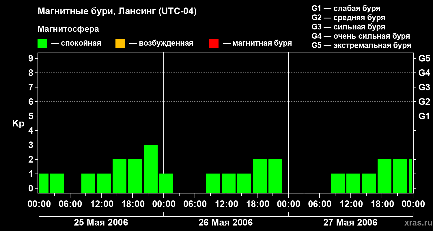 Изменения геомагнитного индекса Kp с 25 по 27 мая 2006 года для средних широт