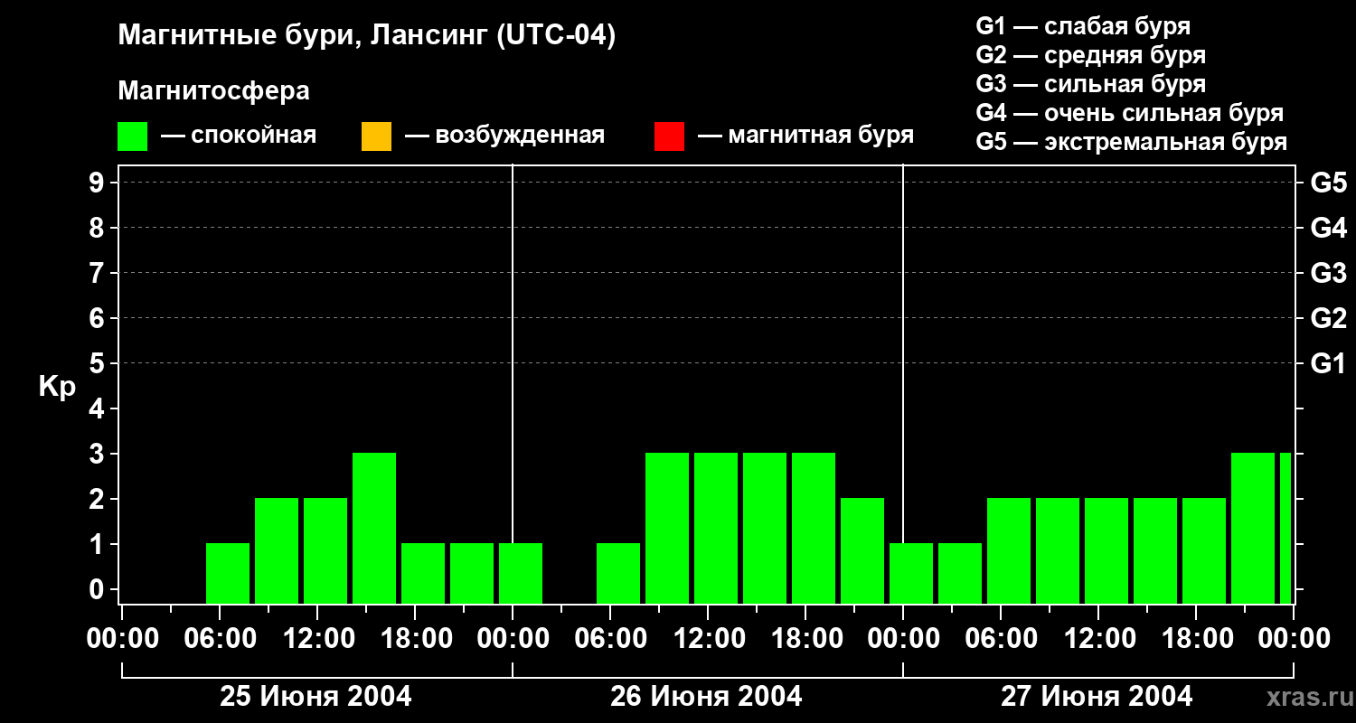 Изменения геомагнитного индекса Kp с 25 по 27 июня 2004 года для средних широт