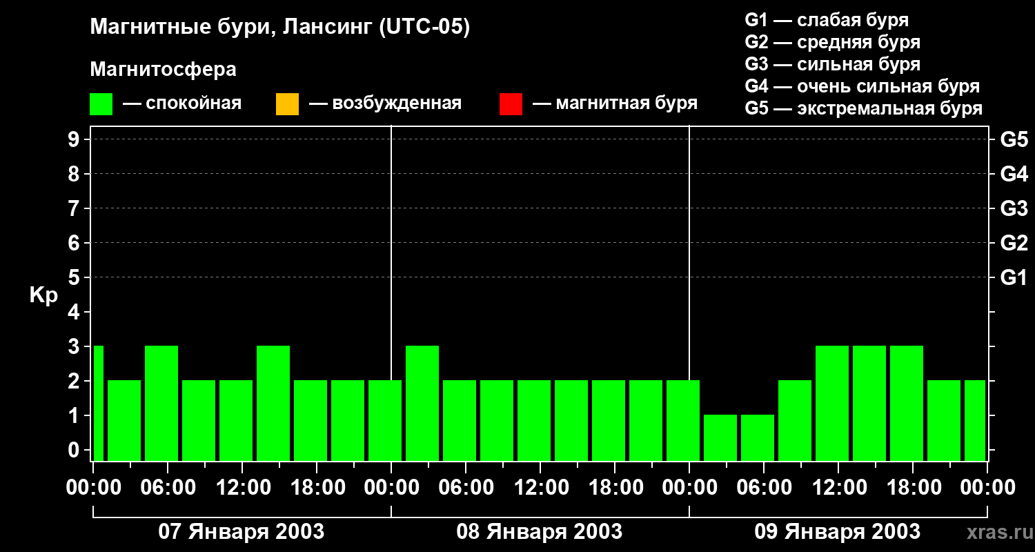 Изменения геомагнитного индекса Kp с 7 по 9 января 2003 года для средних широт